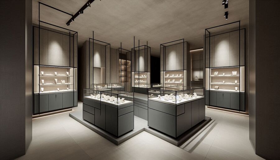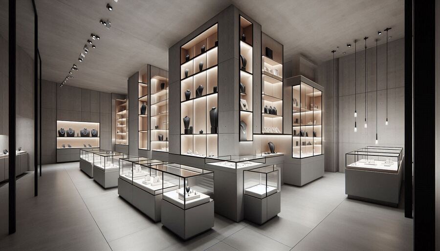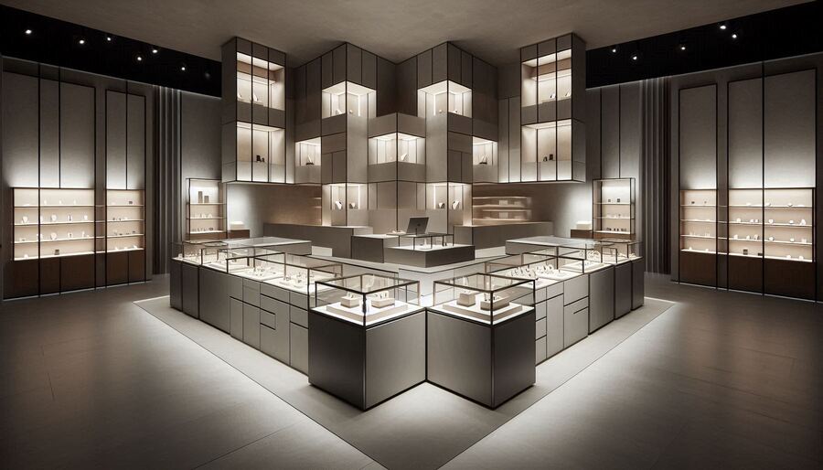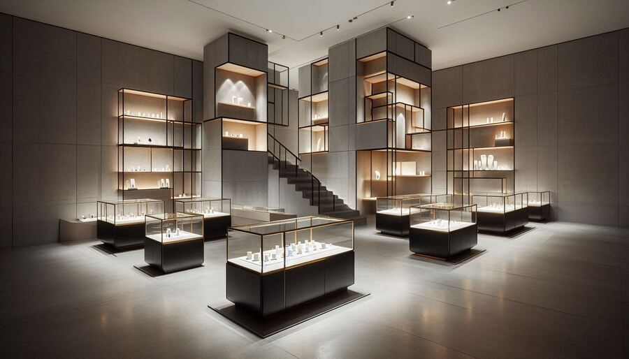 Промт: Minimalist jewelry boutique interior, architectural display cases in geometric formation, using color palette