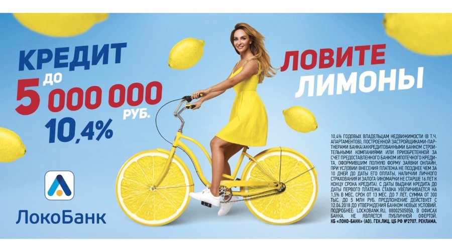 Характерный пример, кампания Локо-Банка с Екатериной Варнавой. В рекламе 2018 года она буквально ловила падающие лимоны, символизирующие деньги. В русском языке «лимон» — жаргонное название миллиона рублей, и креативная команда обыграла это: с продуктами Локо-Банка получить миллион так же просто, как поймать лимон. В ролике лимоны преследуют героиню: сыплются с неба, катятся под ноги, появляются в её снах, подчёркивая навязчивую мечту о крупной сумме. Избавиться от «лимонного наваждения» помогает, конечно, банк: достаточно зайти на сайт и оформить кредит. Такой абсурдный, ироничный сюжет сделал кампанию яркой и запоминающейся.
