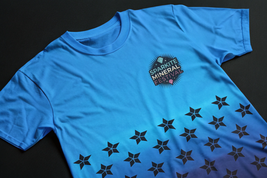 Запрос в ChatGPT: Сгенерируй промпт для создания высококачественного мокапа мерча, фуболки для Фестиваля минералов Sparkite. Она яркого цвета, на ней черные звезды и логотип фестиваля