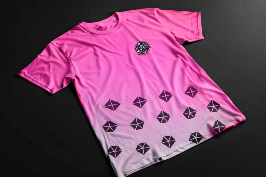 High-quality mockup of a t-shirt for the Sparkite youth mineral festival. The t-shirt is bright pink with a gradient to light pink on a contrasting background. It features black polyhedral stars and the Sparkite logo in a modern, minimalist style. The atmosphere is dynamic, youthful, and energetic. The t-shirt is made of soft cotton or a blend of fabrics, with a visible texture and natural folds. The lighting is studio-quality, evenly distributed, emphasizing the richness of the color and the clarity of the print.