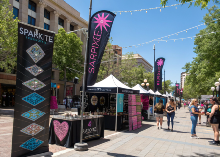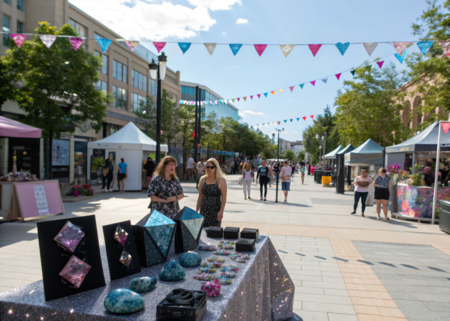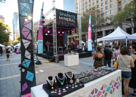 Sparkite’s street festival of minerals in a modern youth style. Sunny day, open urban space with bright decorations and festival flags. In the foreground — shops and stands with jewelry and minerals: sparkling crystals, necklaces, bracelets, rings, decorative stones. The shopping rows are decorated in the Sparkite aesthetic — a combination of black, blue and pink, with elements of brilliance and geometric patterns resembling multifaceted crystals.