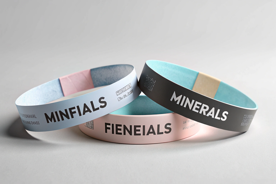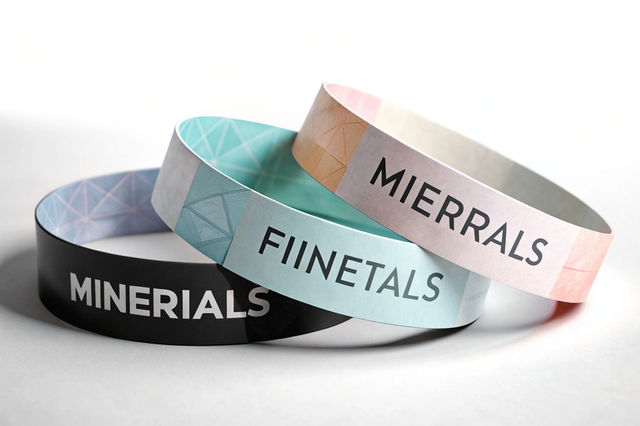 Realistic mockup of paper wristbands for a minerals festival. The wristbands are displayed on a clean white surface, arranged neatly with slight overlapping. Three color variations: black, light blue, and pastel pink. Each wristband features subtle crystal or gemstone motifs, minimal and elegant design. Soft natural lighting, high-resolution studio photo, professional product mockup style.