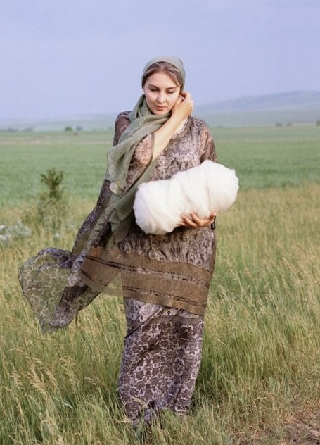 Ингушка держит в руках бобину шерсти — сырье для войлока. Малгобекский район, Ингушетия