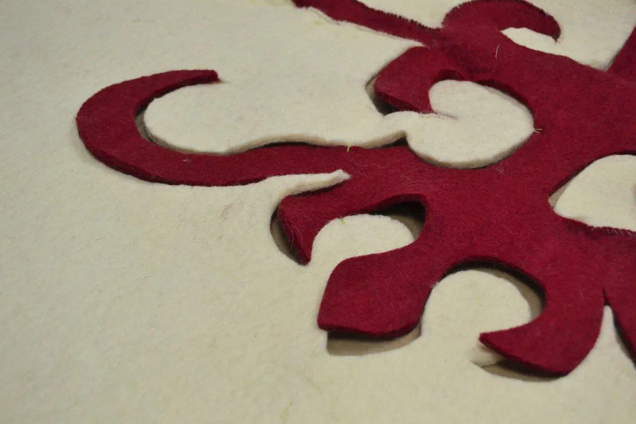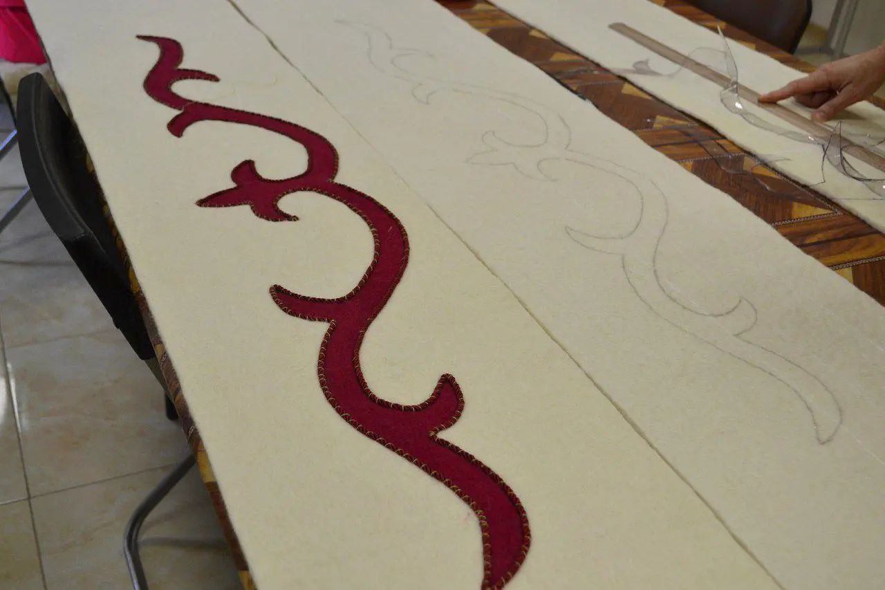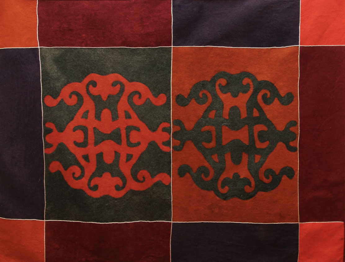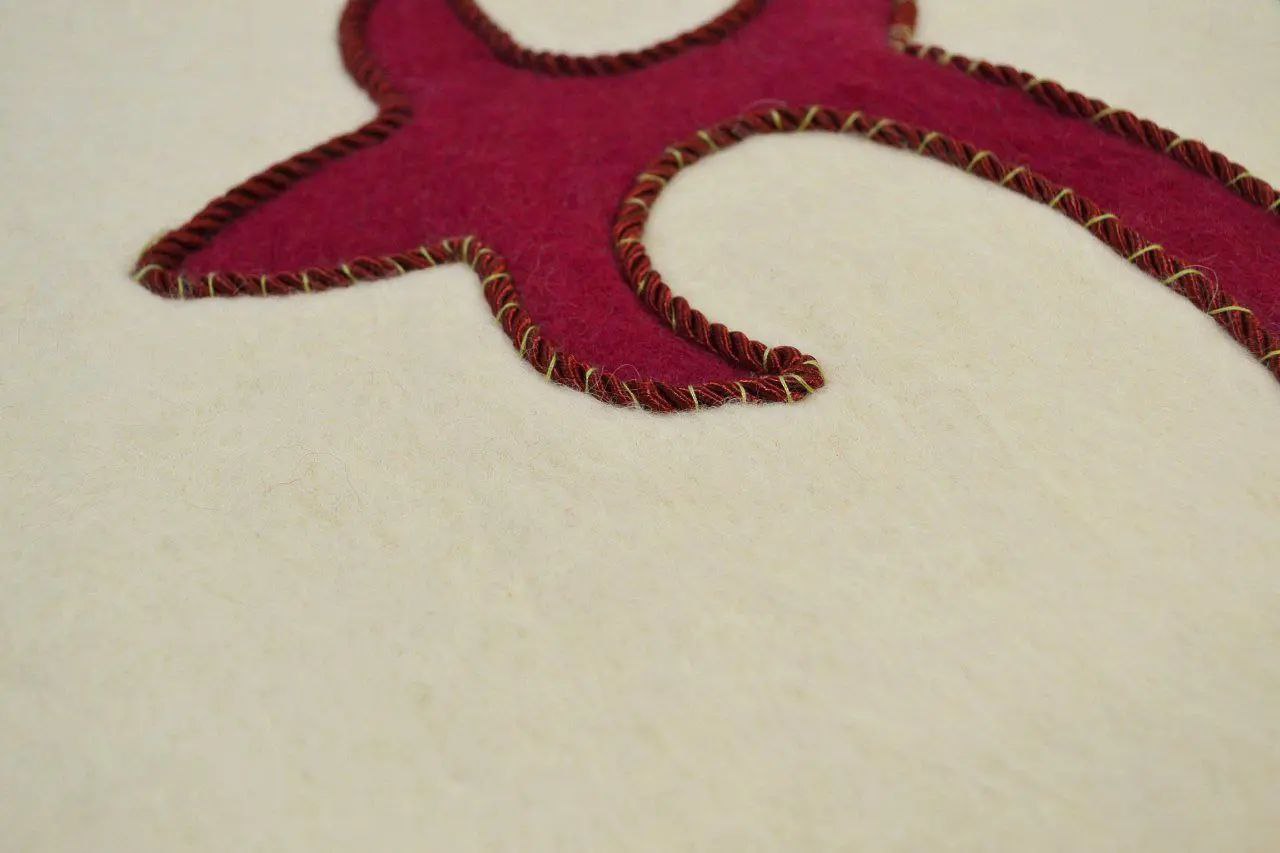 - Техника инкрустации (хетта ферт) Хетта ферт (переводится как «соединённый») — это сложная техника, использующая комбинацию кусочков войлока разных цветов для создания сложных орнаментов. Процесс: Разноцветные куски войлока вырезались по заранее подготовленным эскизам. Эти куски соединялись вручную с использованием нитей или приваливались для создания единой поверхности. Орнаменты часто повторяли традиционные символы: ромбы, круги, зигзаги, а также природные мотивы. Эта техника была трудоёмкой, но давала возможность создавать ковры с детализированными рисунками, которые использовались как украшение дома или в ритуальных целях.