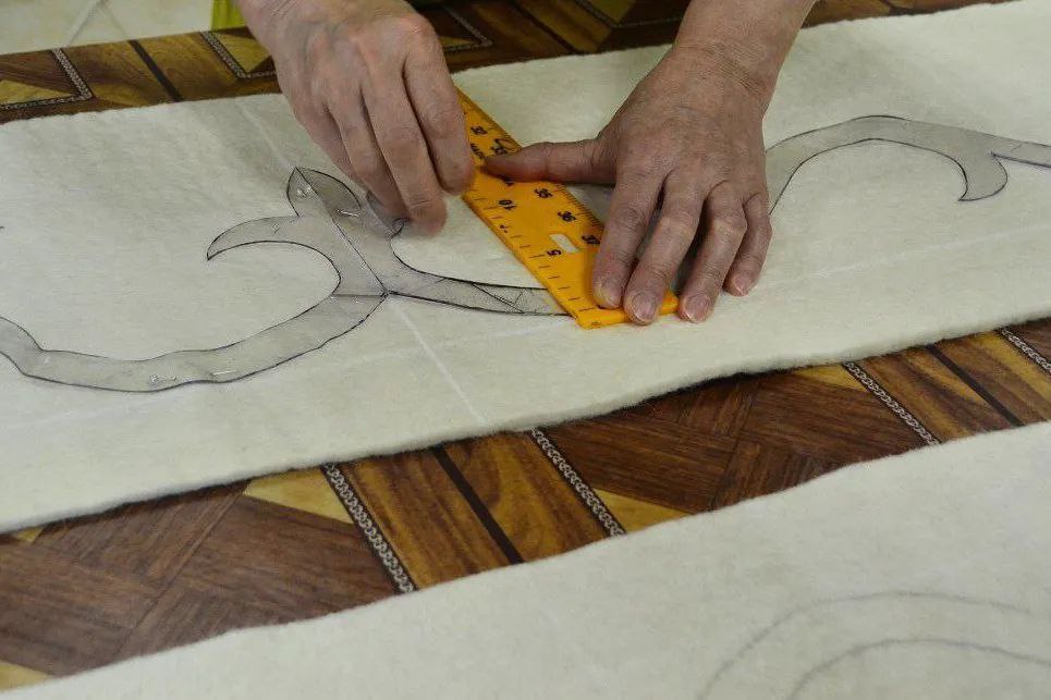 - Валяние (войлок). Техника валяния заключалась в скатывании влажной шерсти с мылом, что давало прочный, плотный материал — основу для ковров. Украшение войлочных ковров выполнялось методом аппликации или инкрустации (сшивание кусочков войлока разного цвета).