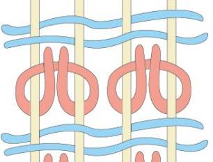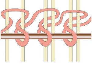Симметричный узел (турецкий или гиордес) Узел затягивается вокруг обеих нитей основы. Особенности: — Узлы более прочные, создают плотную и долговечную текстуру. — Используется реже в Иране, но характерен для северо-западных регионов, таких как Азербайджан, где ткут тебризские ковры.