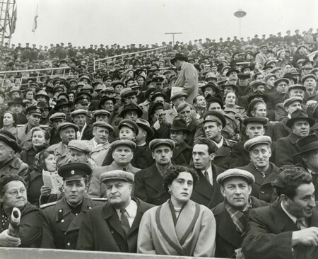 Зрители футбольного матча СССР-Франция на стадионе Динамо, Москва, 23 октября 1955 года. Фотограф Жан-Филипп Шарбонье