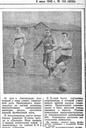 Главным футбольным событием во время Великой Отечественной войны стал матч «Динамо» — «Строитель» (команда ленинградского строительного завода) в осажденном Ленинграде 6 мая 1942 года. Первая команда состояла из игроков «Динамо», «Зенит» и «Спартак», вторая была собрана государственным комитетом спорта и состояла из рабочих. В условиях голода, холода, постоянных болезней и смертей игроки, будучи такими же истощенными жителями Ленинграда, сыграли в футбол, сделав игру символом нескончаемого духа народа, мужественности и победы жизнью над смертью.