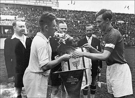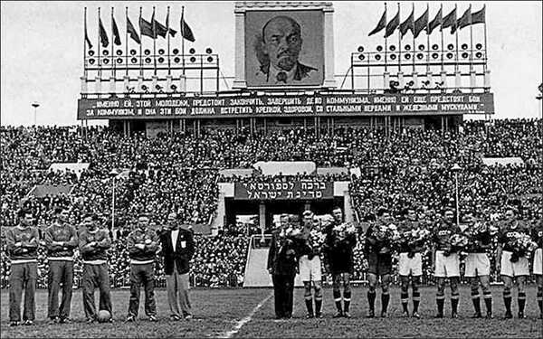 1–11 июля 1956. Центральный стадион «Динамо». Надпись на иврите: «Приветствие спортсменам государства Израиль». 2-Капитаны: Ицхак Шнеор и Игорь Нетто.
