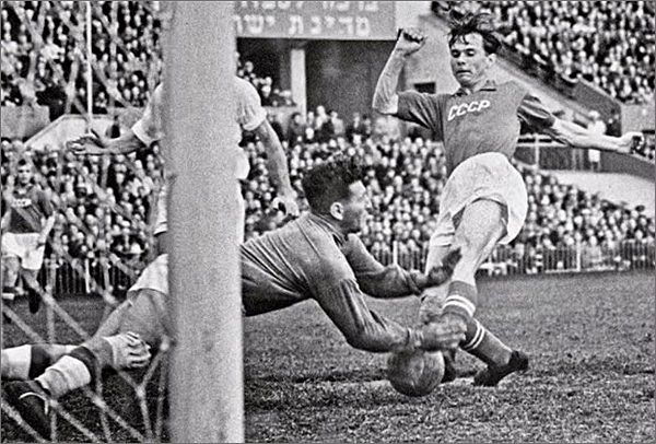 1-Сергей Сальников (№ 10) атакует ворота сборной Израиля. 2-Вратарь сборной Израиля Яков Ходоров забирает мяч в ногах Валентина Иванова. Слева на дальнем плане Борис Татушин.