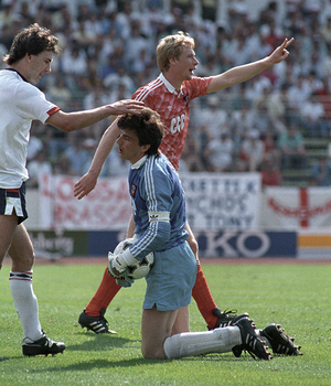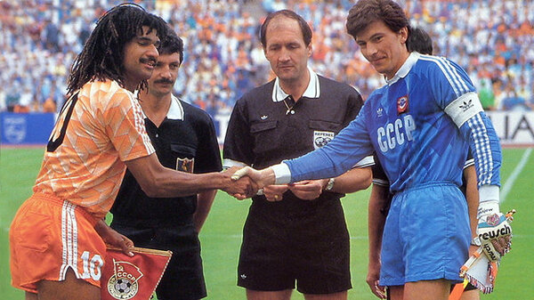 1- Руд Гуллит и Ринат Дасаев жмут руки перед началом финального матча. 2-Брайан Робсон и Ринат Дасаев
