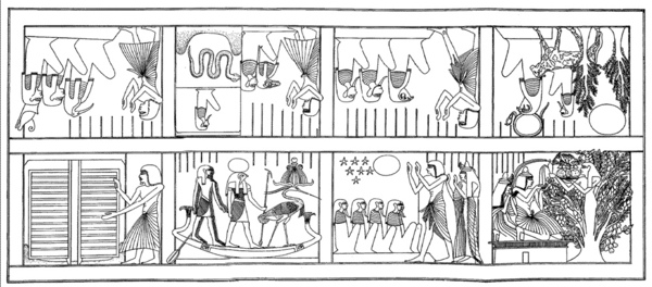 Иллюстрация к 100-й главе Книги Мертвых: «Глава о том, как сделать совершенным умершего и позволить ему спусти / 8 изображений сводчатого потолка Дома Вечности TT1 художника царских гробниц Сеннеджема