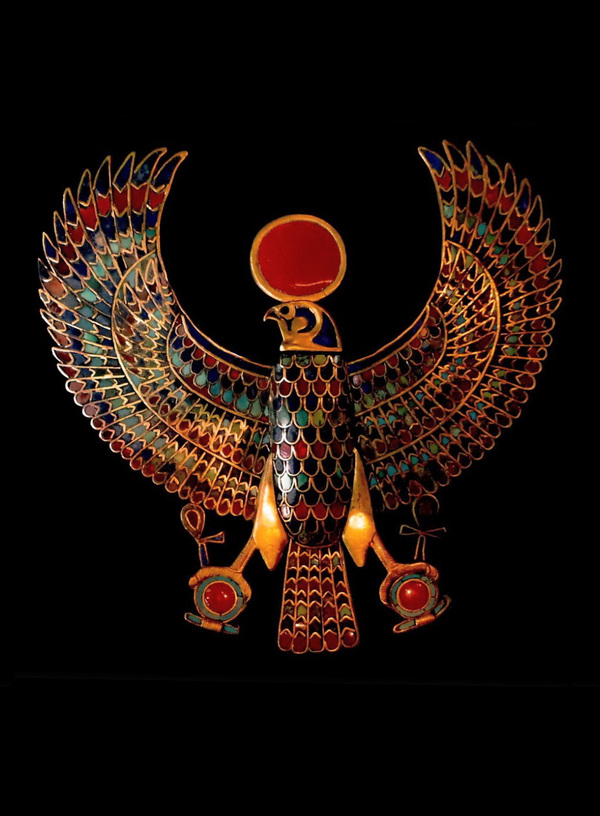 Пектораль в виде сокола с распростертыми крыльями, держащего в когтях символы Жизни и Вечности/Бесконечности (Анх и Шэн). ок. 1332 — 1323 годах до н. э. Нагрудное украшение носимое на цепи