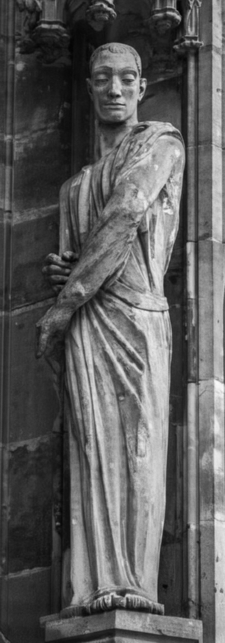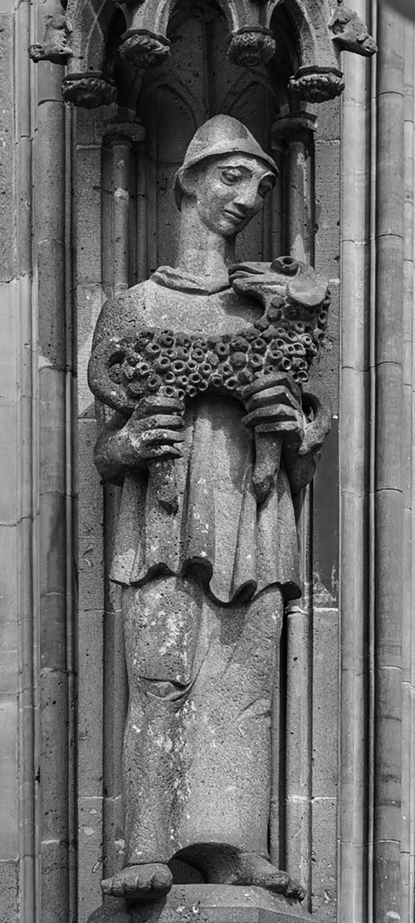 Третий ряд 10 фигур: Georg Stephanus Laurentius Nikolaus Quirinus / Elisabeth Helena Dorothea Barbara Katharina (Q. Das Südturmportal am Kölner Domvon Anna Chiara Knoblauch) Св. Георгий, Стефан Первомученик, Св. Лаврентий, Св. Квирин / Св. Елизавета, Елена, Доротея, Варвара и Катерина.