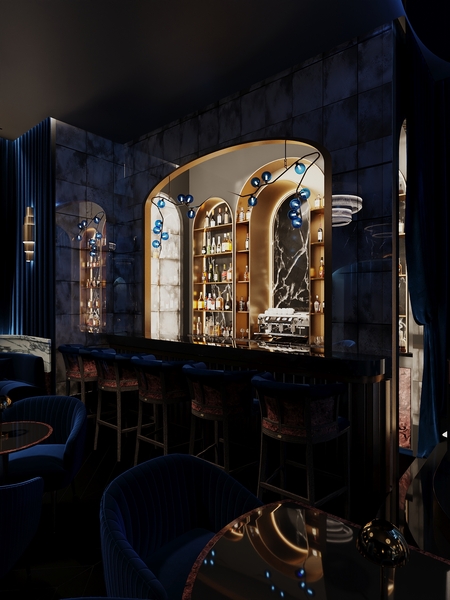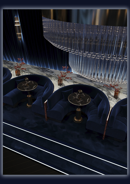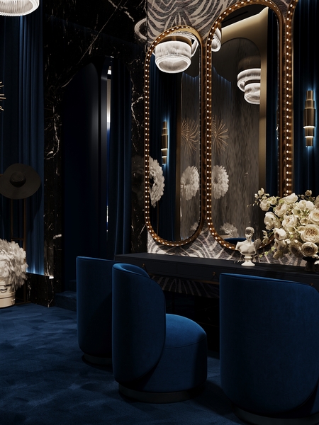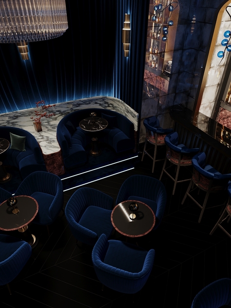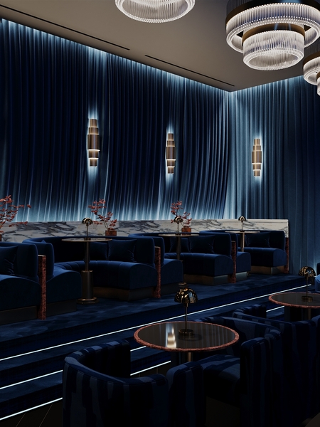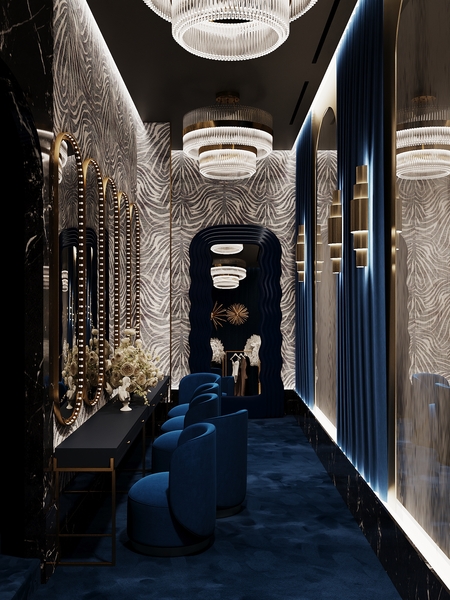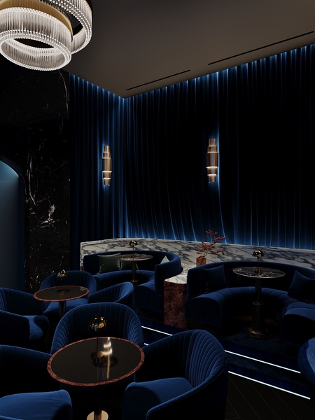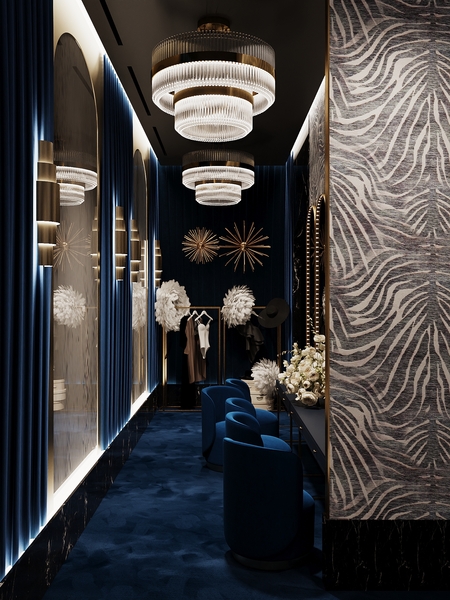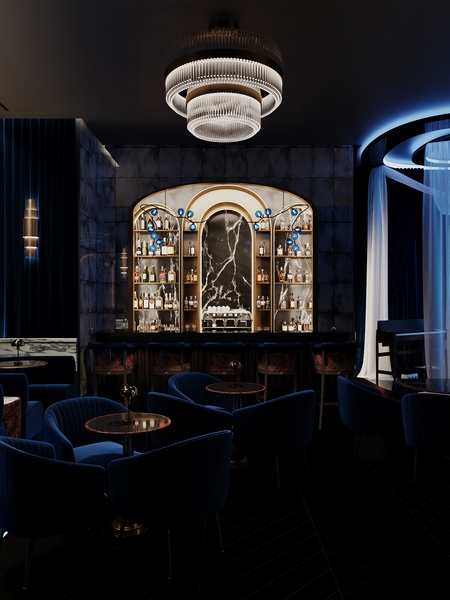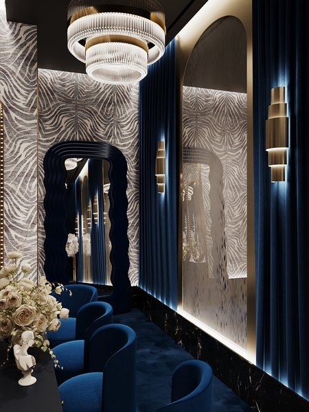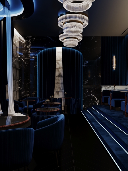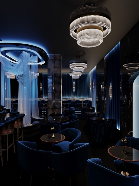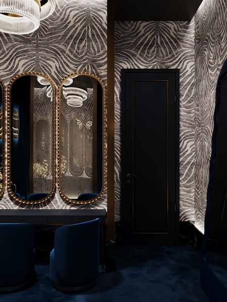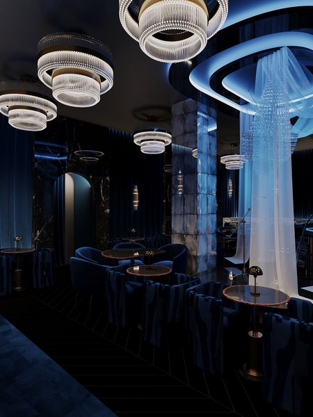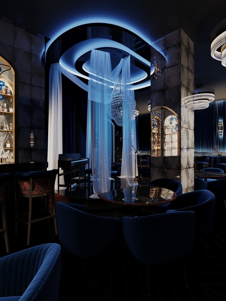 Вдохновленная атмосферой роскоши и мистики, эта концепция объединяет изысканный гламур и уединенность ночи. Основной элемент — эффектная хрустальная люстра в центре зала второго жтажа, создающая иллюзию звездного неба и подчеркивающая элегантность пространства. Темные глубокие оттенки в сочетании с мягким голубым и серебристым освещением придают интерьеру таинственный и притягательный характер.