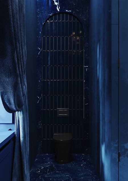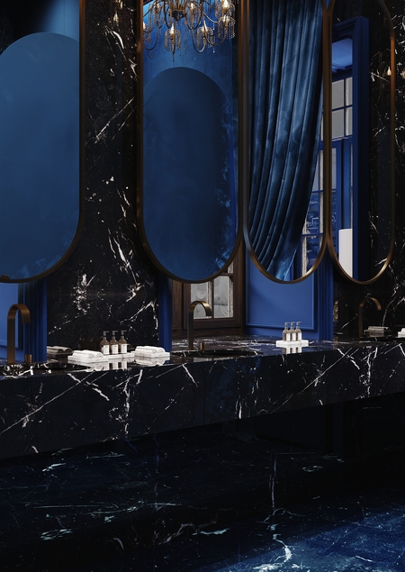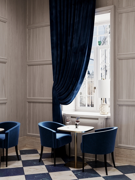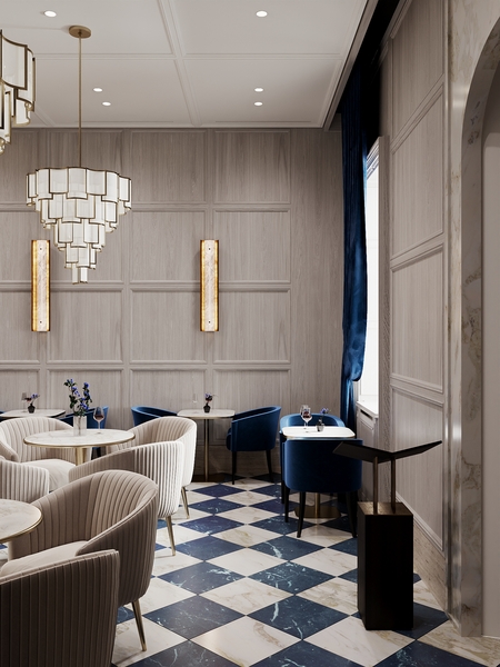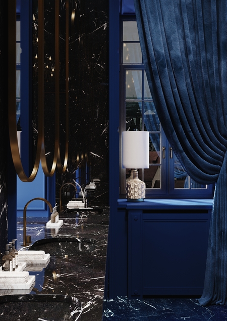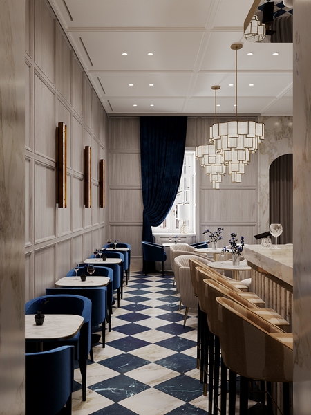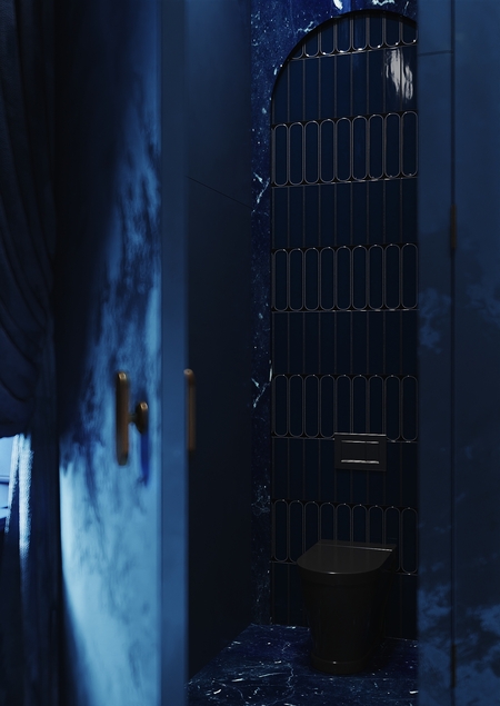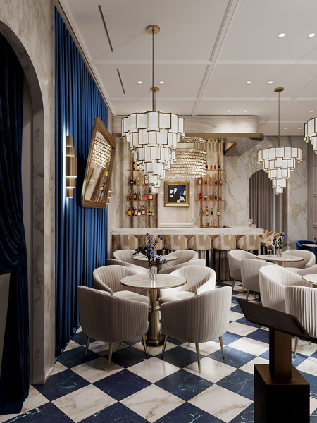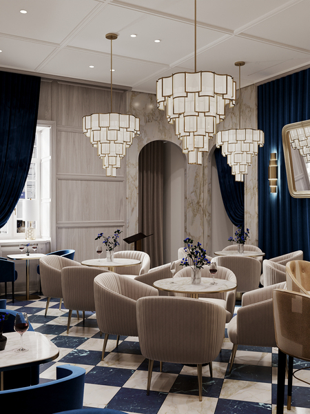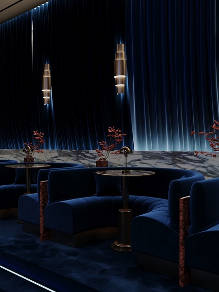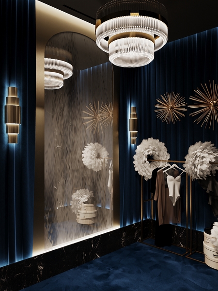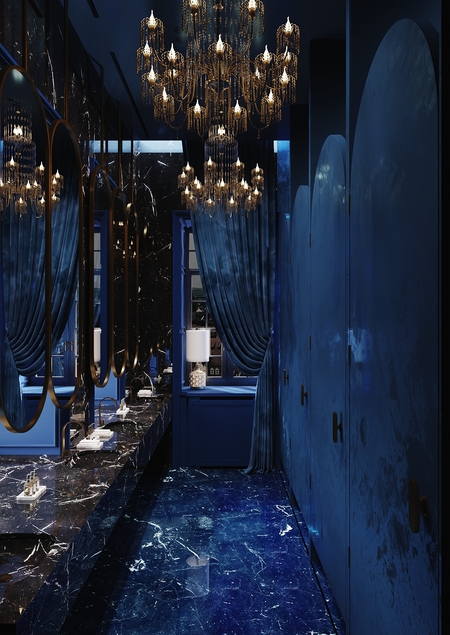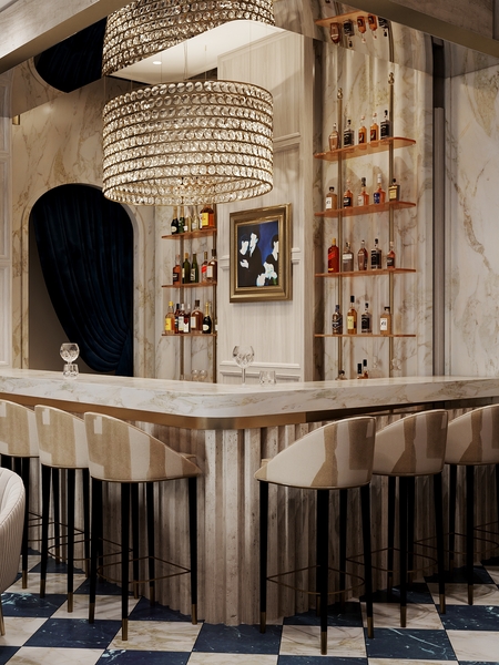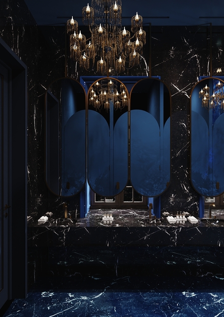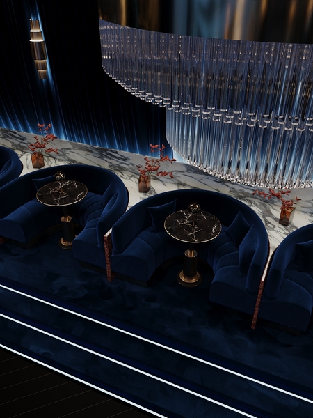 Вдохновленная атмосферой роскоши и мистики, эта концепция объединяет изысканный гламур и уединенность ночи. Основной элемент — эффектная хрустальная люстра в центре зала второго жтажа, создающая иллюзию звездного неба и подчеркивающая элегантность пространства. Темные глубокие оттенки в сочетании с мягким голубым и серебристым освещением придают интерьеру таинственный и притягательный характер.