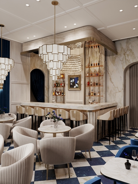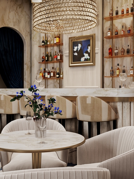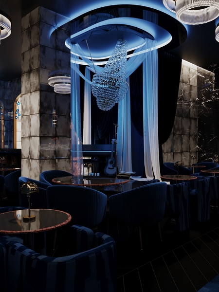На сцене — пианино и гитара, символы музыкального искусства, приглашающие гостей погрузиться в атмосферу живого выступления. Обилие зеркальных и мраморных поверхностей усиливает эффект роскоши, а мягкие шторы разделяют зоны, создавая интимную атмосферу для каждого гостя.