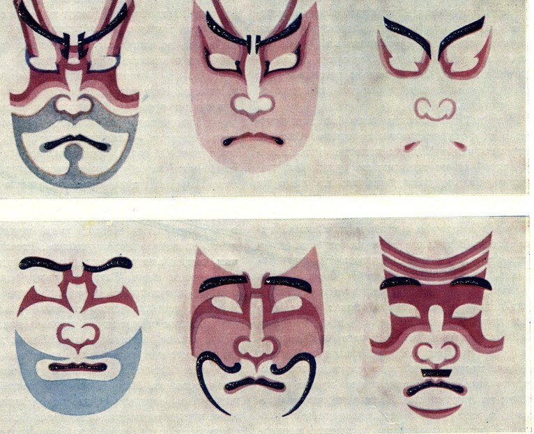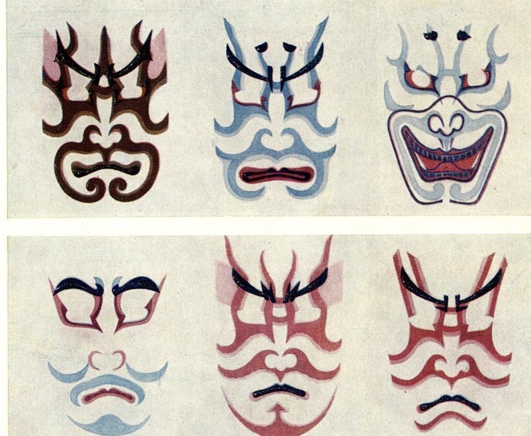 Различные цвета в гриме использовались для подчёркивания характеров персонажей. Красный цвет символизировал справедливость, страстность, смелость. Синий — хладнокровие, злость, безнравственность. Черный и коричневый — божественность, потусторонность