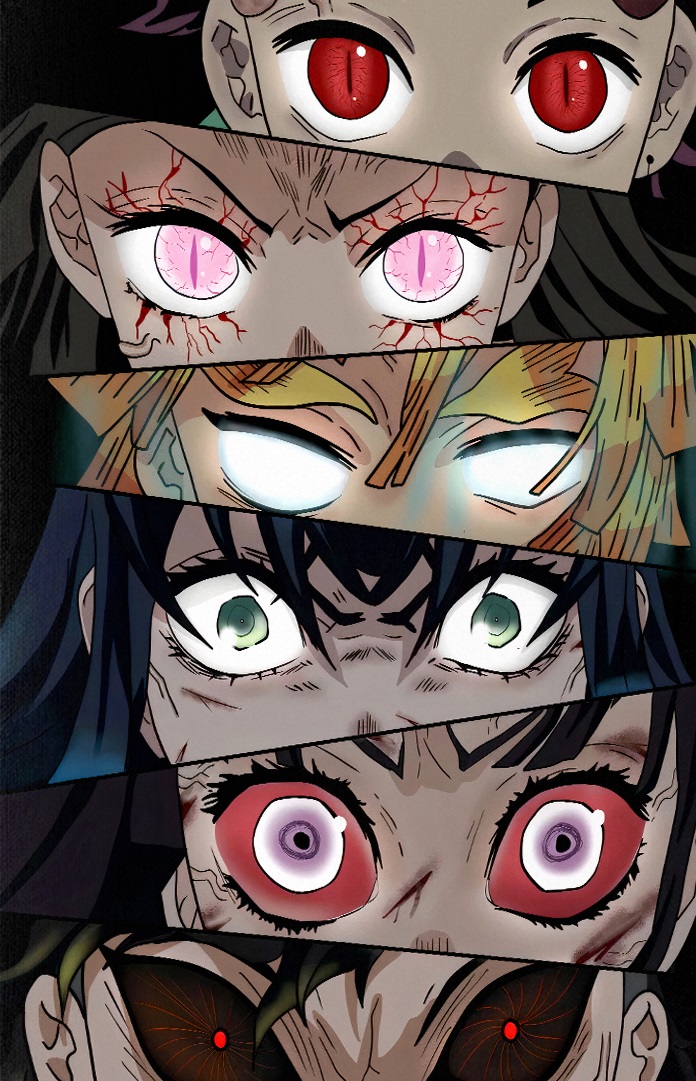 Глаза персонажей аниме «Клинок рассекающий демонов» «налитые кровью». Актеры кабуки вливали румяна в глаза для достижения такого эффекта.