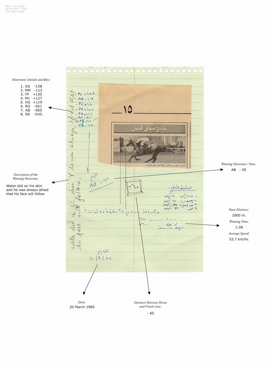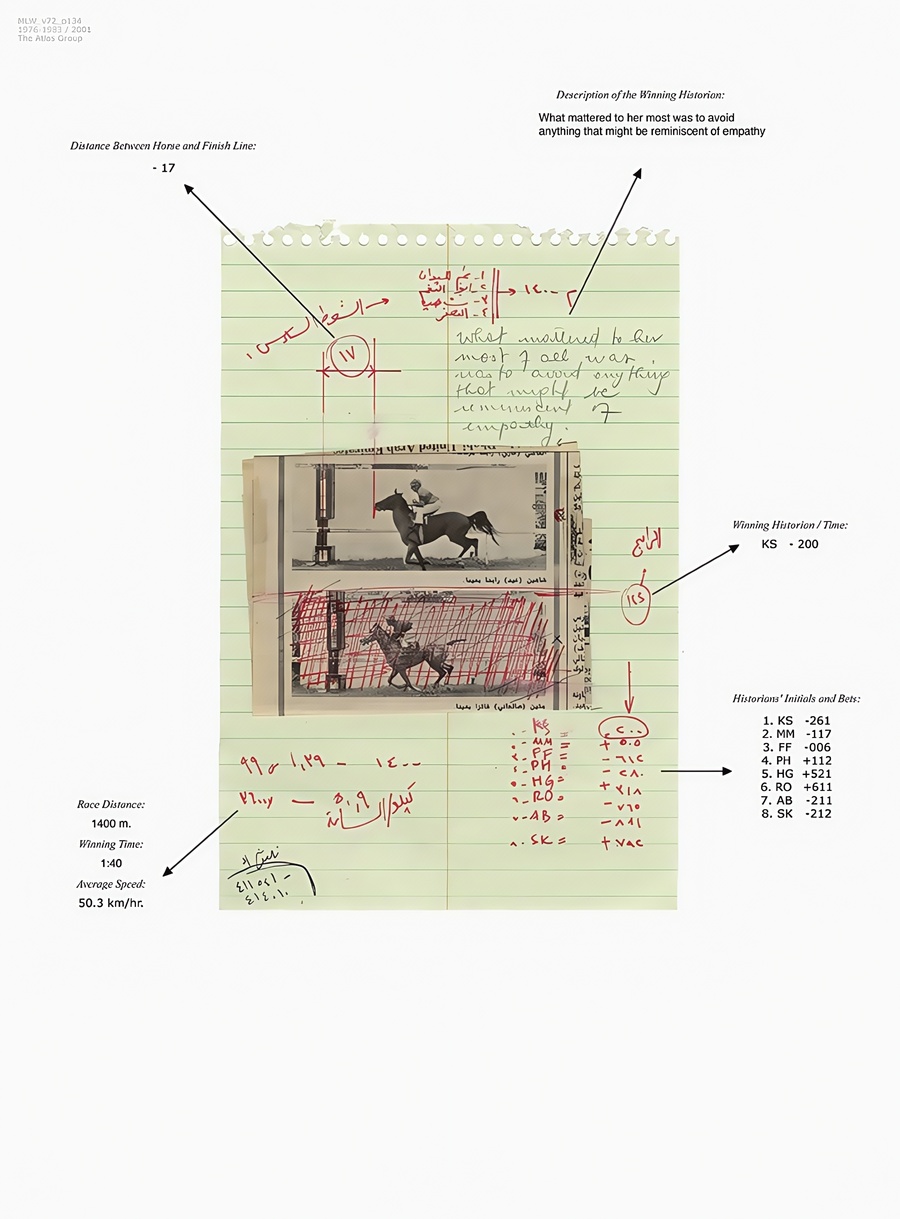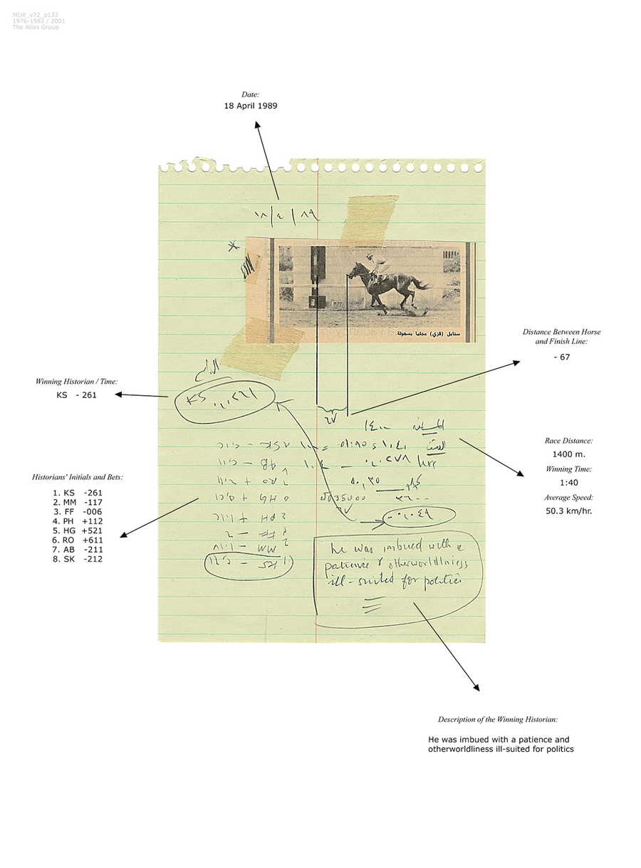 Проект The Atlas Group — это вымышленный архив гражданской войны в Ливане, созданный художником Валидаом Раадом. Он собирает документы, фотографии, рукописи, аналитические таблицы, но часть этих материалов — чистая художественная конструкция, придуманный след истории. Выставка превращается не в хранение прошлого, а в машину его производства. Сама форма архива выглядит убедительно, почти официально, и именно эта убедительность заставляет задуматься: почему мы безоговорочно верим тому, что видим в музейной рамке?