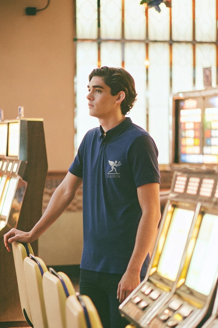 Мокап выполнен в Recraft AI, на который был наложен логотип казино: mockup of a young man in a in a dark blue polo in the casino standing by slot mashines, dark aesthetic, warm lighting, the polo shirt should be clearly visible.