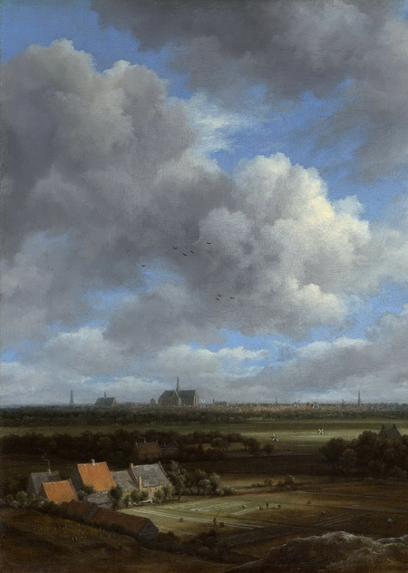 Перед зрителем — широкий панорамный вид на родной город художника. Основное внимание сосредоточено не на сюжете, а на самом воздухе и его изменчивости. Свет мягко рассеивается в облаках, создавая ощущение глубины и влажности атмосферы. В отличие от Лоррена, который насыщал пейзажи идеализированными античными сценами, Рёйсдал работает с реальной природой и небом как самостоятельной темой. Ему важно показать, как выглядит обычный день в Голландии, с её характерным светом и горизонтами. Эта картина показывает, как пейзаж становится средством наблюдения и фиксации реального климата.