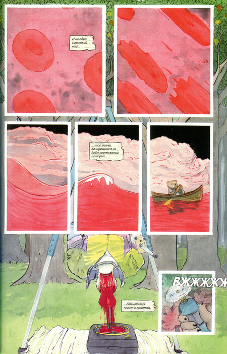 Как я уже писала выше — стиль автора скорее напоминает рисовку в детских книжках, а не в кровавых триллерах о серийных убийцах. Графика акварельная и во всем комиксе в основном используются только разбавленные, пастельные тона. И лишь изредка, в самых жестоких сценах, мы можем увидеть насыщенный красный, который специально контрастирует со всей стилистикой комикса.