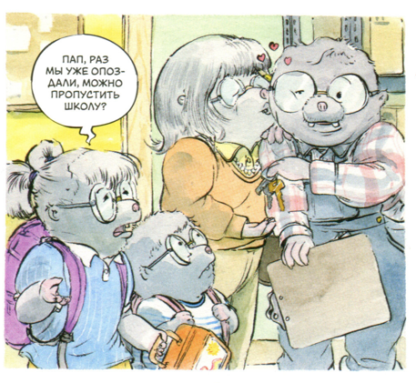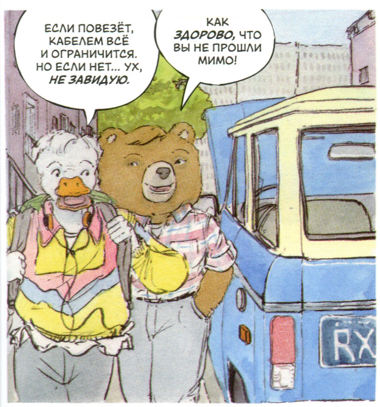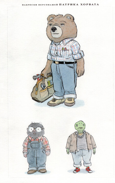 Мне захотелось сделать отдельную часть о персонажах комикса, так как автор заметно постарался над тем, чтобы сделать их разными и интересными. Так как все герои — антропоморфные животные, Патрик Хорват постарался сделать их легко узнаваемыми. При этом, различия в размерах у них нет. Например, Сэм — медведица и Найджел — мышь примерно одинакового роста. Также автор не забыл и о особенностях некоторых животных. В одной из глав дедуля-черепаха прячется в панцирь, и создается впечатление, будто бы у него нет головы.