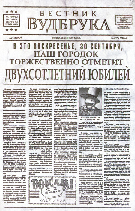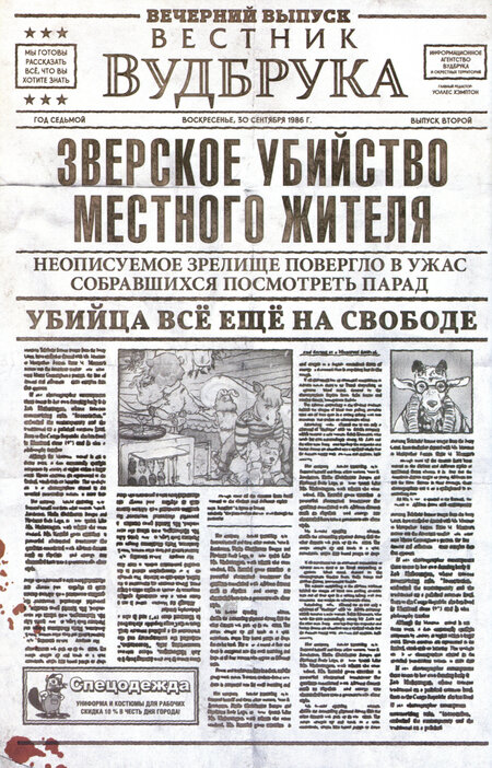 Также после каждой обложки идет еще одна страница: вырезка из «Вестника Вудбрука» — местной газеты. В ней мы можем прочитать о событиях прошлой головы и немного напомнить себе о происходящем. Очень нравится, что такое «ревью» совсем не выбивается из повествования и вписано в общий стиль. Так что даже когда читаешь уже готовое произведение, а не онгоинг, каждую такую страницу хочется разглядывать.