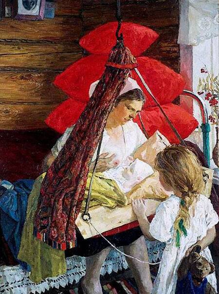 Если в 1920-е женщина соревновалась с мужчиной, то в начале 40-х происходит откат к традиции. Женственность опять ценится, но в контролируемых рамках. Это видно даже в визуальных деталях: в поздних сталинских картинах женщины одеты в легкие платьица пастельных тонов, распущенные волосы сменяются аккуратными прическами. На парадных полотнах женщины-медсёстры, учительницы, колхозницы изображены с мягкой улыбкой, часто с детьми. Тем не менее официально транслируемый идеал остаётся двойственным: «работающая мать», которая и в поле ударно трудится, и дома образцовая хозяйка. Такая двойная нагрузка считалась нормой. Искусство это иллюстрировало: женщина с серпом на фоне трактора — а рядом сцена, где она же укладывает детей спать.