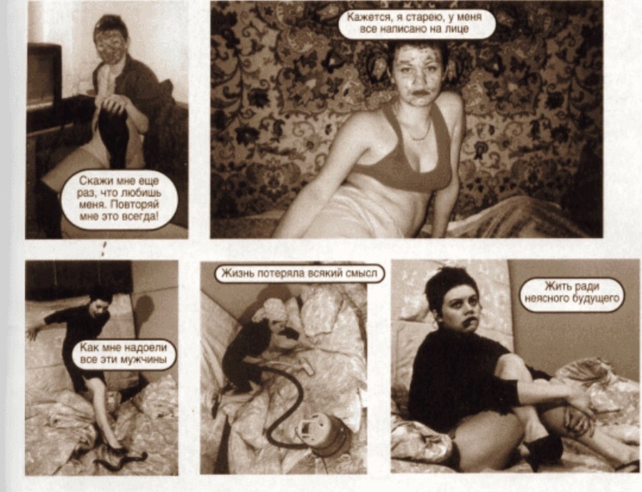 В фотографиях Людмилы Горловой («Фотороман „Как я люблю“», 1997) героиня тщетно пытается соответствовать гламурным идеалам с экрана, но заканчивает разочарованием. Это была сатира на навязанную женственность нового времени.