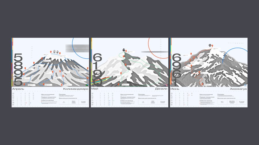 Каждый месяц посвящен одной горной вершине, о которой рассказывается: ее высота, расположение, основные маршруты восхождения, первые покорители, установленные рекорды, среднее время подъема, уровень сложности и оптимальный сезон для восхождения