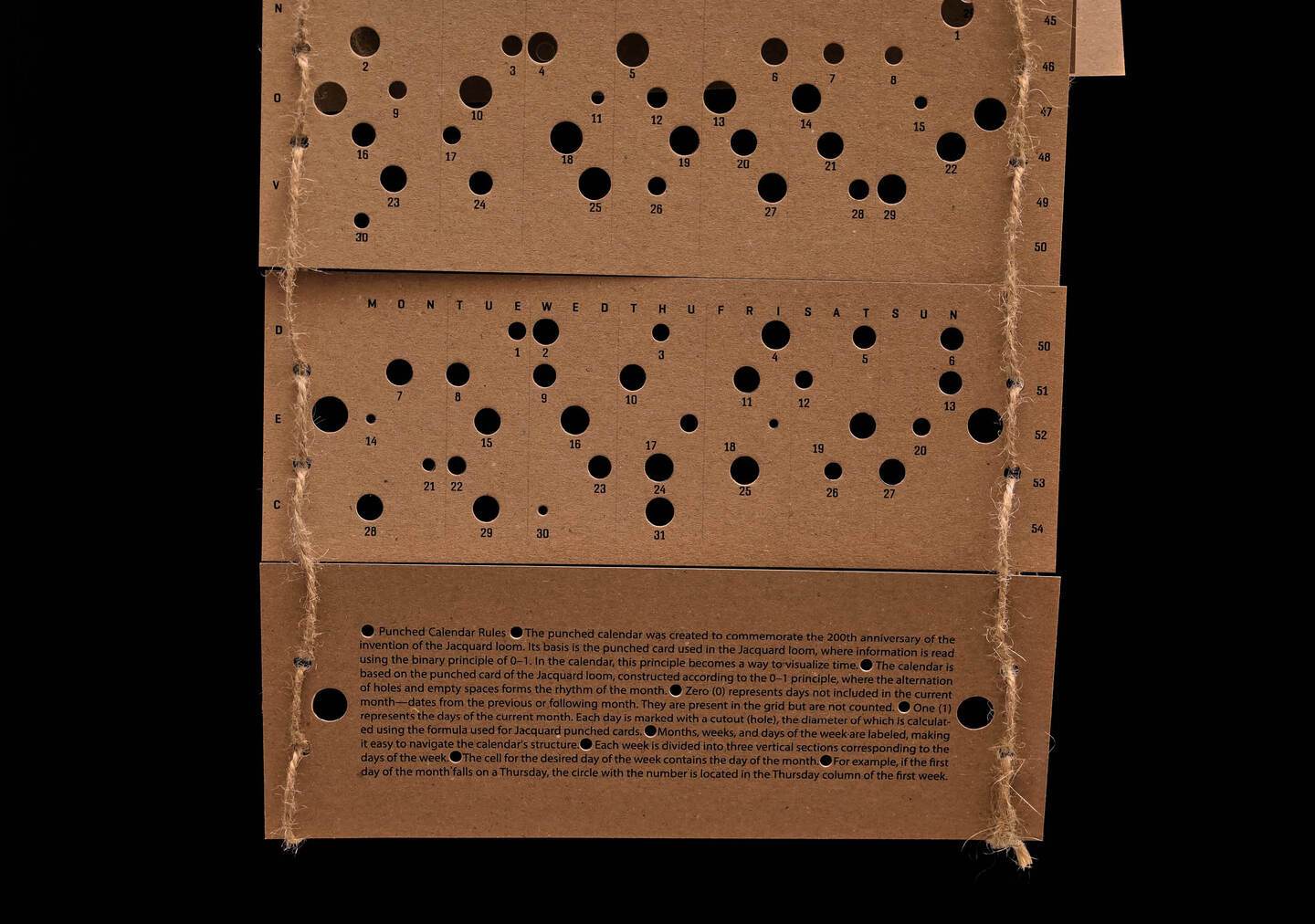 Представленный календарь визуально вдохновлён структурой оригинальной перфокарты жаккардового станка. Каждый месяц — как «ячейка данных», наглядно показывающая, как инженерная идея XIX века положила начало цифровому способу мышления и стала прототипом современных технологий программирования и автоматизации.