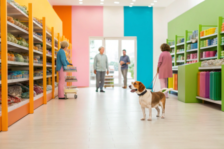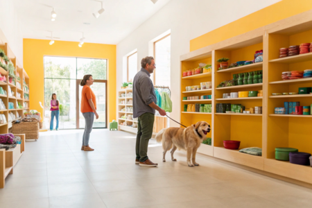 Модель: Recraft Mockup Product Photo Промпт: A pet store interior with happy people and a dog near the shelves with pet supplies. Color it all #6C5D8C, 72CEF2, 65BFBF, E27D5B, D9B4B4
