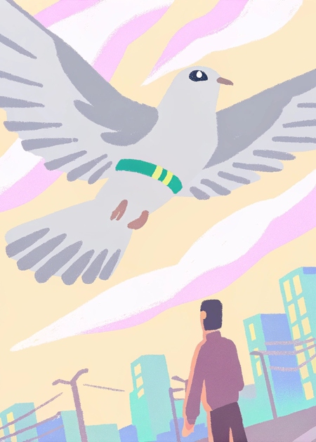 Изображение на упаковке Модель: Recraft image Промпты: 1. Create a vector illustration of a dog with no line art in colors #6C5D8C, 72CEF2, 65BFBF 2. Make a bird flying over the city with a tracker on its paw in the colors #E27D5B, D9B4B4