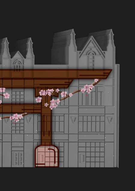 Ханами — это праздник любования сакурой и приходом весны. Мэппинг, изображенный на здании академии Маяк, отражает суть праздника, он нежен и плавен, как и сама атмосфера мероприятия. Звучащий под джазовый саундтрек, он погружает зрителя внутрь абстракции.