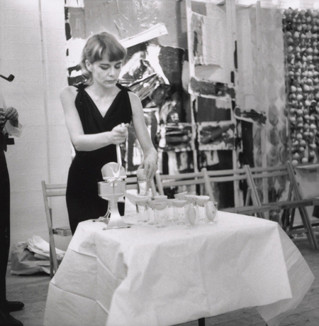 В 18 Happenings in 6 Parts Аллана Капроу это смещение видно особенно ясно. В архивных фотографиях совсем нет ощущения «театральности»: люди выполняют элементарные действия — выжимают апельсины, двигают мебель, читают короткие фразы. Но именно в сочетании этих обыденных жестов возникает новое пространство. Пластиковые перегородки, которые разделяют комнату, превращают зрителя в участника: от него требуется ходить по инструкции, менять места, переключать внимание. В кадрах хорошо видно, что это не спектакль, а ситуация, где роли зрителя и исполнителя уже не различаются — все просто существуют внутри некоего общего процесса.
