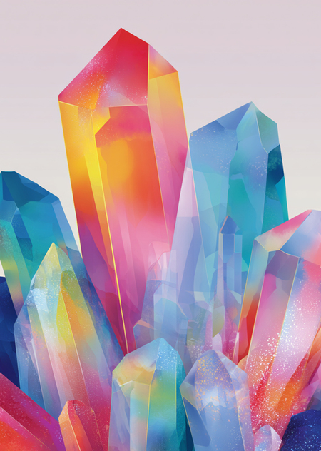 Promt: и Create an advertising poster for the Crystal Prism art object. The design should use bright shades of rainbow colors in pastel tones, combining different levels of transparency. Use a variety of crystal shapes that create a sense of dynamism and creativity. The poster should be visually striking, reflecting the essence of the art object, while also inviting viewers to explore the Crystal Prism
