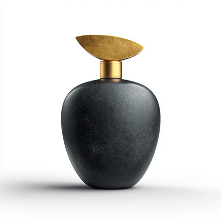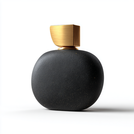 Minimalist luxury perfume bottle, shaped like a smooth, river-worn black stone. Made of opaque black glass. The cap is a minimalist, asymmetrical piece of brushed gold, resembling a tiny Mayan artifact. Isolated on a pure white background. Photorealistic, studio shot, soft shadows.