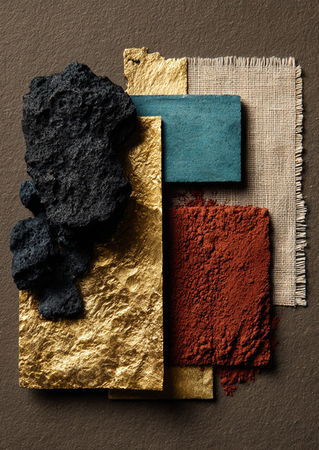 A flat lay composition of high-quality material swatches for a luxury brand: a piece of rough black obsidian, a smooth tile of turquoise, a sheet of hammered gold leaf, a swatch of deep terracotta-colored clay, and a piece of natural undyed linen. Top-down view, even lighting.