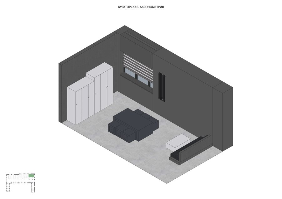 - введение - вдохновение - план - аксонометрия кластера - аксонометрия и коллаж помещений - визуализация