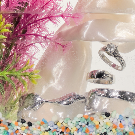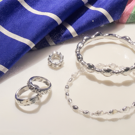 Minimalist still-life composition featuring a luxurious silk scarf, silver rings and sleek silver bracelets. Bright, clean color palette with vivid yet elegant highlights, smooth textures