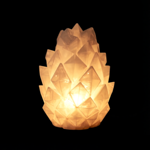 Промпт: geometric crystal-like lamp design, imitating mineral forms, polymer plastic material, matte finish, glowing effect when lit