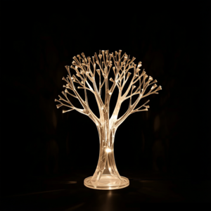 — Форма: Стилизованное дерево с ветвистым узором. — Материал: Прозрачный акрил с металлическими вставками. — Особенности: Свет проходит сквозь ветви, создавая мягкие световые пятна на стенах и полу.