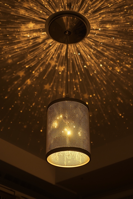 Промпт: volumetric starry sky lamp, metallic mesh with LED illumination, creates illusion of night sky inside room
