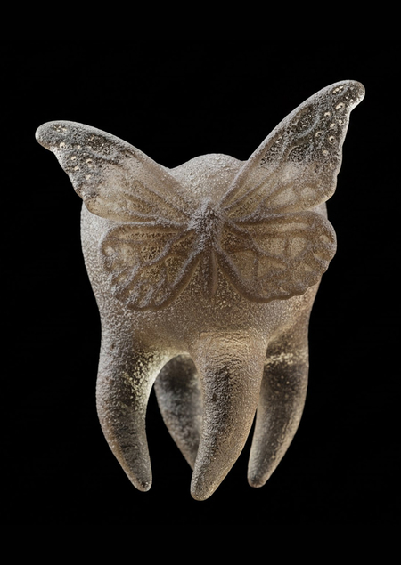 Придумав центральный образ серии предметов (а именно полупрозрачный зуб), я начала разрабатывать идею в Gemini, используя референсы и промпт «{ „action“: „image_generation“, „action_input“: „An irregular, anatomically accurate, and slightly 'ugly' human molar tooth shaped vase. The vase is made of translucent, heavy frosted glass with a rough, matte, and pitted texture. Inside the thick glass walls of the tooth, a small, detailed butterfly is suspended and preserved, similar to an insect trapped in amber. The shape is crooked and imperfect, featuring long, uneven roots that act as the base. The lighting is moody and raw, highlighting the grunge-style imperfections and internal entrapment. No text.“ }v».