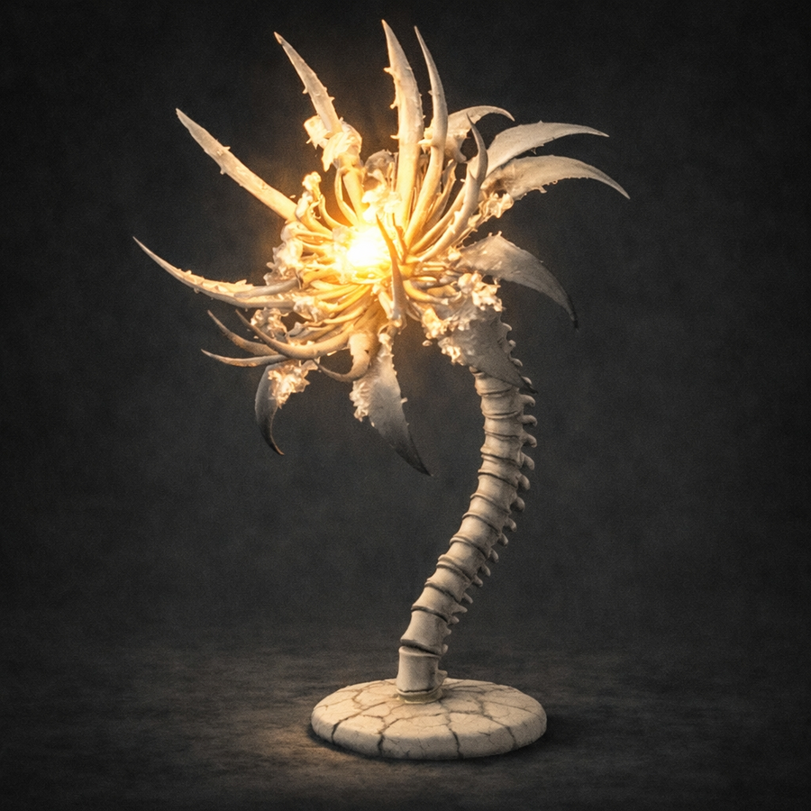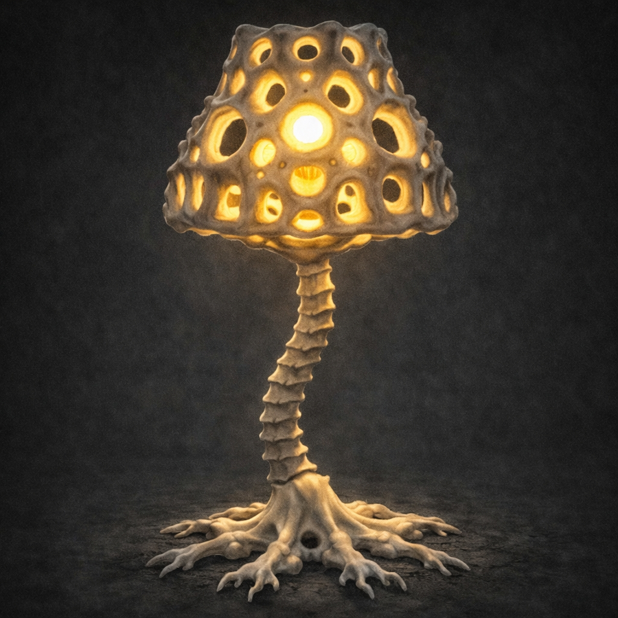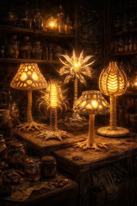 Эти светильники — не спроектированные объекты, а фиксации найденных форм. Это остатки организмов, в которых растительное и животное начало перестали быть разделёнными. Их свет — не электричество. Это последний функциональный орган. Мы не создаём — мы классифицируем то, что осталось.