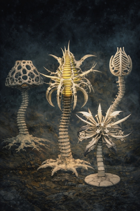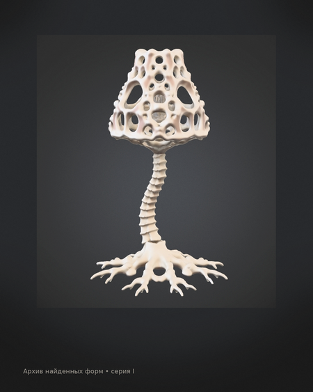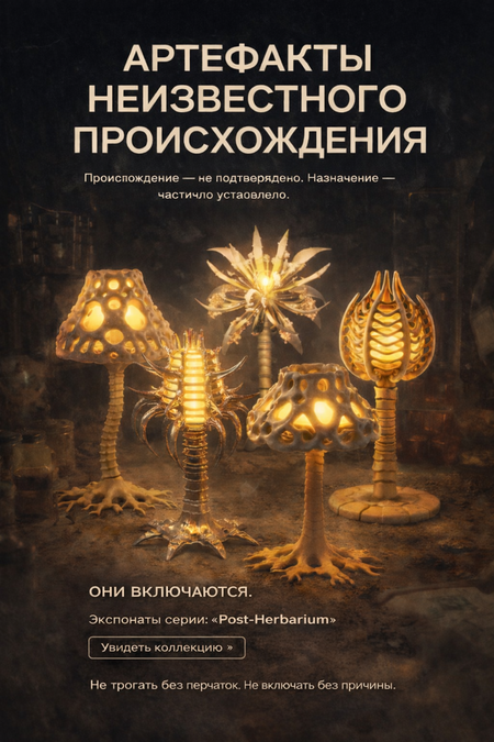Коллекция светильников, созданная как каталог находок из вымышленного отдела биологии, где изучаются мутировавшие виды на границе растения и животного. Они выглядят так, будто были найдены в заброшенной лаборатории или на археологических раскопках, но происхождение не подтверждено.