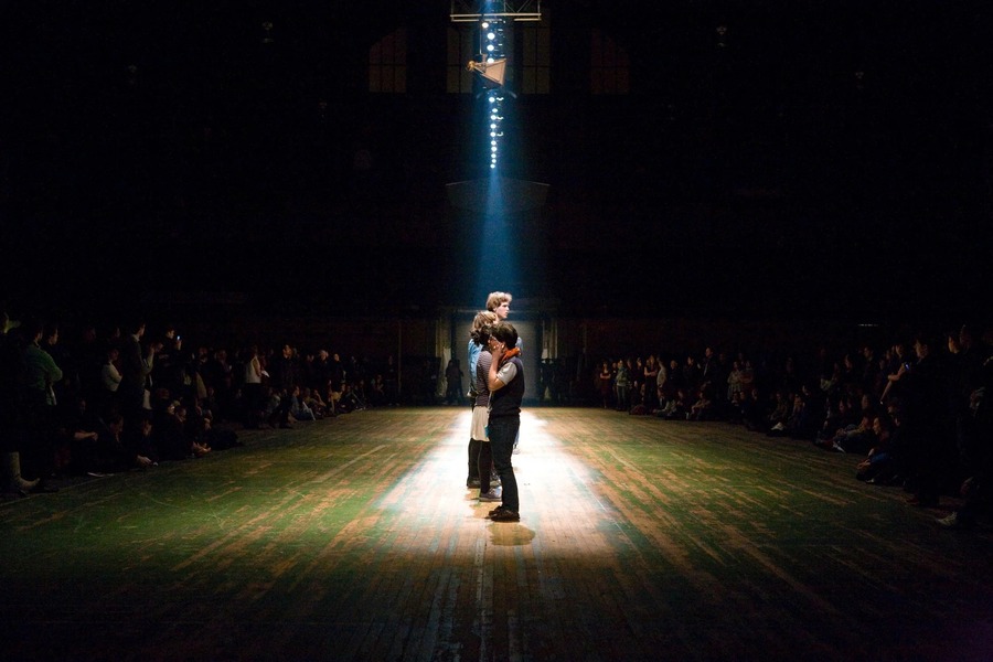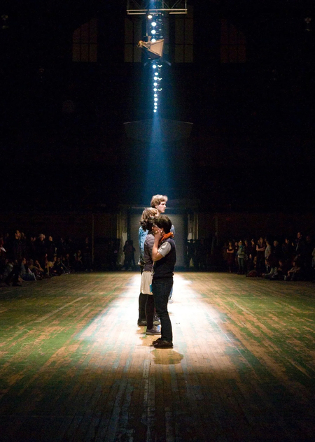 Подростки исполняют разные фрагменты партий оркестра, распределившись по помещению. ПОэтому когда зритель ходит по пространству для него постоянно меняется звучание произведения — архитектура многоголосья «собирается» заново с каждой новой точкой.