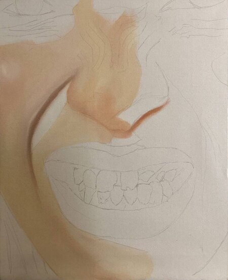 На этой картине представлен крупный план деформированного женского лица и тела, лежащего на зеркальной поверхности. Искаженные пропорции, телесные и красные тона создают ощущение давления и уязвимости. Работа исследует анормативную телесность через отказ от идеализированных форм, подчеркивая физическую, природу плоти. Нестандартный ракурс и отражение бросают вызов, вызывая дискомфорт и переосмысление норм.